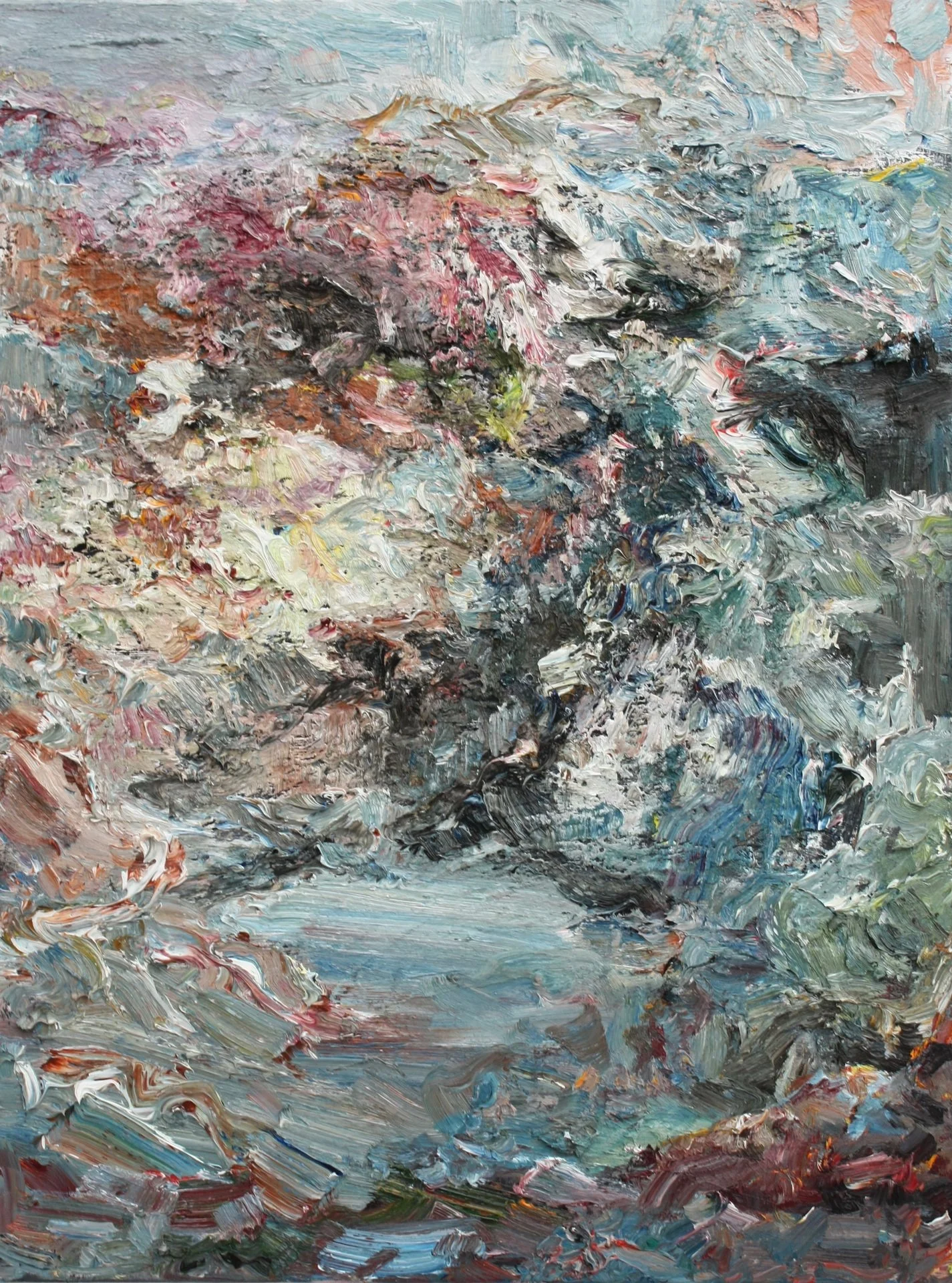 Dat vertaalt zich in haar werk in een krachtige beeldtaal. Verf wordt een feest van licht en en kleur. Ze schildert vanuit de materie zegt ze, maar de beleving van een landschap en de herinnering er aan, is altijd haar startpunt. Hoewel haar werken erg spontaneïstisch lijken, is het tegendeel waar: ze bouwt ze rustig en gecontroleerd op, laag over laag, met vaak een lange droogtijd er tussen. Het wordt al snel boetseren en beitelen. Textuur lijkt de bovenhand te halen, tot het werk vaak meer sculptuur dan schilderij lijkt, tot de verf op het doek soms woest kolkt en klotst. Passie. Er lijkt soms een soort boosheid, woede zelfs, onder te zitten. “Het moet er uit” zegt ze. En met een knipoog: “Anders word ik agressief. Ik kan niet dun schilderen: ik mis dan diepte en beweging.”
